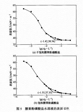 從圖5可以看出,在較低濃度時(shí),水溶液的表面張力隨著表面活性劑濃度的增加顯著降低,當(dāng)濃度達(dá)到一定值時(shí)水溶液的表面張力隨著濃度的增加幾乎不發(fā)生變化。不飽和腰果酚磺酸鹽的cmc為38.1mg/L,γcmc為38.54mN/m;飽和腰果酚磺酸鹽的cmc為28.2mg/L,γcmc為37.35mN/m。可見,腰果酚經(jīng)過加氫飽和后,臨界膠束濃度和臨界膠束濃度下的表面張力均降低。這表明,當(dāng)親油基的碳原子數(shù)相同時(shí),親油基為飽和烷基鏈的磺酸鹽表面活性劑越容易在溶液表面上吸附,降低表面張力的效率越高;且達(dá)到飽和吸附時(shí),形成的吸附膜的極性越低,導(dǎo)致形成的表面張力也越低,即表面活性劑降低的表面張力越高。