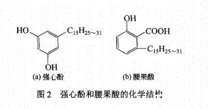 從圖1可以看出,兩種生物質(zhì)腰果酚磺酸鹽的收率隨著反應(yīng)溫度的升高先增加隨后變化較緩,而活性物含量先增大后減小。在磺化溫度為25℃時(shí),不飽和腰果酚磺酸鹽和飽和腰果酚磺酸鹽的活性物含量達(dá)到最大值,分別為84.0%和98.7%,此時(shí)收率也較高,分別為85.0%和88.9%。當(dāng)磺化溫度高于25℃時(shí),兩種腰果酚磺酸鹽的活性物含量降低,收率變化較小。分析原因可能為,磺化溫度太高,會(huì)導(dǎo)致過磺化,生成的副產(chǎn)物水溶性較差,導(dǎo)致活性物含量較低。在相同條件下,飽和腰果酚磺酸鹽的收率和活性物含量高于不飽和腰果酚磺酸鹽,這主要是由于不飽和腰果酚中含有一定量的雜質(zhì)強(qiáng)心酚和腰果酸,結(jié)構(gòu)見圖2。這兩種物質(zhì)的結(jié)構(gòu)與腰果酚的結(jié)構(gòu)相似,分離難度較大;且這兩種物質(zhì)也發(fā)生磺化反應(yīng),導(dǎo)致不飽和腰果酚磺酸鹽的活性物含量較低。然而通過對(duì)不飽和腰果酚進(jìn)行側(cè)鏈加氫生成飽和腰果酚后,物理性質(zhì)發(fā)生變化,飽和腰果酚為棕色固體,強(qiáng)心酚和腰果酸為液體,很容易分離。因此,飽和腰果酚磺酸鹽的活性物含量高于不飽和腰果酚磺酸鹽。