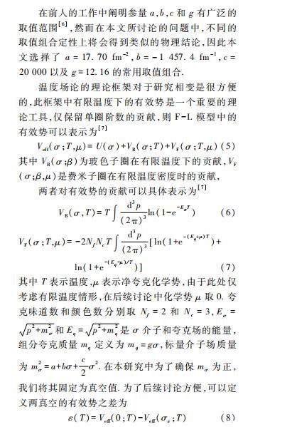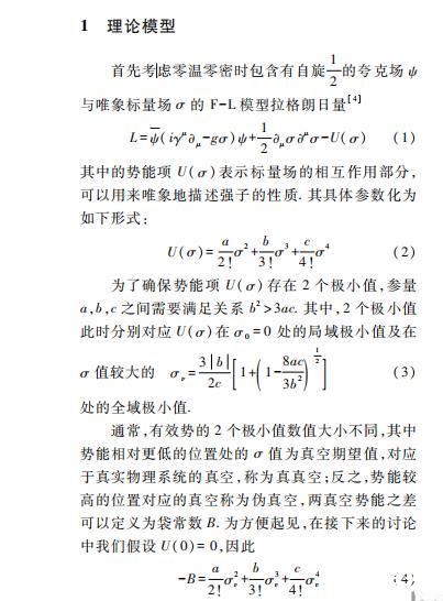 本文具體采用的模型是具有夸克禁閉性質(zhì)的Friedberg-Lee模型(F-L Model)。F-L模型最初用于描述低能時強子的行為,將強子看做真空中的袋狀孤子解,為QCD理論中的禁閉行為提供了非常直觀的物理解釋。不僅如此,該模型也被擴展至有限溫度密度下夸克物質(zhì)的退禁閉相變的研究,提供了研究夸克強子相變性質(zhì)的有利手段。但是該模型只能給出有限溫度密度下夸克物質(zhì)一級相變的結(jié)果,無法討論平滑過渡(Crossover)相變和相臨界截點相關(guān)的物理問題,具有一定局限性。不過本文主要研究夸克強子一級相變下氣泡或液滴的動力學(xué)問題,F(xiàn)-L模型是比較合適的模型。