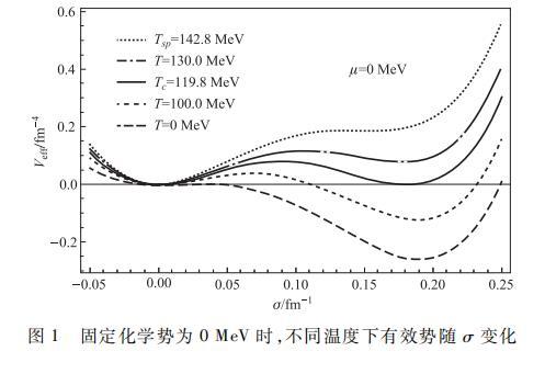 為了更加準(zhǔn)確地描述夸克-膠子等離子體(Quark-Gluon plasma,QGP)與強子物質(zhì)之間的相變特征,在溫度密度有限的情況下,通過嚴(yán)格的數(shù)值方法,固定化學(xué)勢為μ=0 MeV,作出如下有效勢Veff隨σ場變化的函數(shù)關(guān)系圖像。其中,由上至下曲線的溫度依次設(shè)定為T=142.8,130.0,119.8,100.0以及0 MeV.如圖所示,在溫度相對較低時,每條勢能曲線都具有兩個極小值和一個極大值,一個極小值位于σ較小的σ0處,另一個極小值位于σ較大的σv處,其間存在一個局域極大值,對應(yīng)兩極小值之間存在的勢壘。