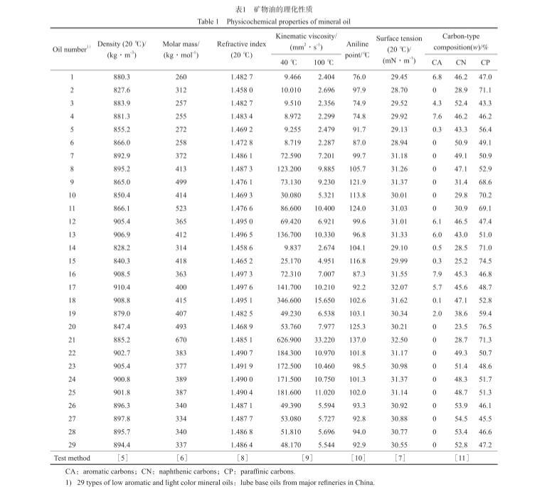 29種常見的低芳淺色礦物油:取自國內(nèi)主要煉油廠的潤滑油基礎油,包括主要的石蠟基基礎油和環(huán)烷基基礎油,不包括深色高芳烴礦物油;從精制程度看,包括高壓加氫深度精制油品,也包括溶劑精制和白土精制工藝精制油品;從碳型結(jié)構(gòu)看,包括芳環(huán)碳(CA)含量為零的油品,也包括CA含量小于10%(w)的油品。礦物油的理化性質(zhì)見表1。