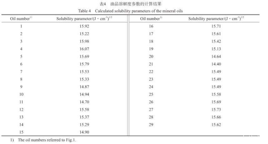 2)由擬合公式計算的11種有機溶劑的溶解度參數與文獻值的最大相對誤差為2.4%。29種常見的低芳淺色礦物油的溶解度參數計算值為14.40~16.07(J/cm3)1/2,與大部分石蠟基油和環(huán)烷基油的溶解度參數值相符,證明基于表面張力的溶解度參數擬合公式具有較好的準確性。