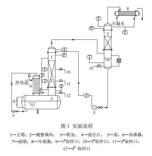 實驗流程如圖1所示。實驗裝置由主塔、副塔、冷凝系統(tǒng)、加熱系統(tǒng)四大部分組成。主塔為內(nèi)徑400mm的不銹鋼精餾塔,填料層裝填高度1.8m,每盤填料高200mm,共9盤。主塔塔頂上升蒸汽及其冷凝液在副塔內(nèi)進行換熱,得到飽和的回流液,避免過冷現(xiàn)象的發(fā)生。塔釜再沸器采用熱導油加熱,換熱面積為27.5m2。塔頂冷凝器采用冷卻水制冷,換熱面積為29.9m2。實驗采用常壓下的全回流操作。