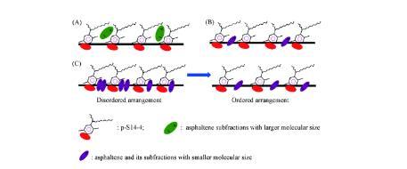 隨著時間的推移,界面上的活性分子由無序排列轉(zhuǎn)變?yōu)橛行蚺帕?,如圖6(C)所示。在此過程中,界面活性分子的脫附速率大于吸附速率,界面濃度不斷減小,導(dǎo)致IFT升高直到脫附速率等于吸附速率。因此,DIFTs曲線呈“V”型。在此情況下,IFTmin不等于IFTequ.結(jié)果表明,小分子尺寸的瀝青質(zhì)及其亞組分與P-S14-4分子的協(xié)同作用主要體現(xiàn)在瞬時的IFTmin值上。也可通過圖5證實,隨著A,A3和A4濃度的增加,IFTmin明顯降低,這表明隨著分子尺寸較小的瀝青質(zhì)組分濃度的增加,混合吸附膜變緊密,協(xié)同作用增強。瀝青質(zhì)主要通過與表面活性劑形成混合吸附膜和改變油相的性質(zhì)來影響IFT。