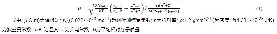 式中:μ(C·m)為偶極矩;NA(6.022×1023mol-1)為阿伏伽德羅常數(shù);n為折射率;ρ(1.2 g/cm3)為密度;k(1.381×10-23J/K)為波茲曼常數(shù);T(K)為溫度;εr為介電常數(shù);M為平均相對分子質(zhì)量。