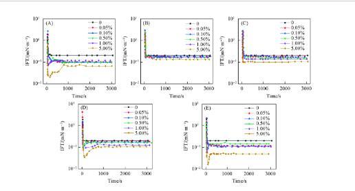 此外,活性分子稀疏地排列在界面上,如圖6(B)所示,并形成稀薄的混合吸附膜。因此,隨著時間的推移,吸附速率和脫附速率達到平衡,IFTs曲線也呈“L”形。在高濃度時,瀝青質(zhì)組分獲得了較高的能量,能夠突破油水界面能壘,因此這些組分能夠更快地擴散到界面,并與P-S14-4分子無序地排列在界面上。當(dāng)這些亞組分與P-S14-4分子之間形成了最緊密的混合吸附膜時,明顯的協(xié)同作用產(chǎn)生,導(dǎo)致IFT達到最小值。