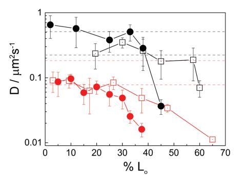 圖 2 擴(kuò)散系數(shù)(D)的實(shí)驗(yàn)值 小域 (1–3 mm) 作為面積百分比的函數(shù) 由液體有序相。 正方形代表中性系統(tǒng)和 環(huán)繞帶電系統(tǒng)。 黑色符號(hào)對(duì)應(yīng) 氣水界面處的單層和雙層的紅色符號(hào)。 虛線對(duì)應(yīng)于計(jì)算的 Dt 值的范圍 域大小的范圍,使用方程 (2) 或 (3)。 實(shí)線只是畫的 引導(dǎo)眼睛。