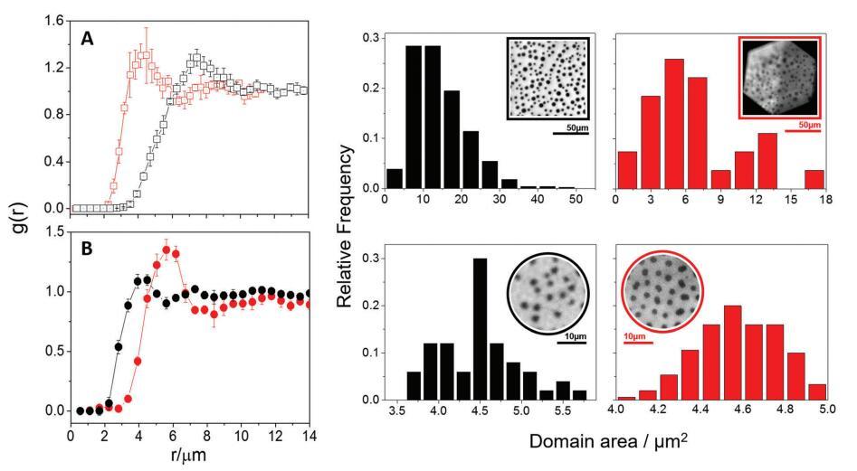 圖 3 中性 (A) 和帶電 (B) 域的徑向分布函數(shù)及其各自的域區(qū)域分布。 雙層顯示為紅色 和黑色的單層。 (A) 中的 %Lo 對(duì)應(yīng)于 20–23%,而 (B) 中的 %Lo 對(duì)應(yīng)于單層和雙層的 16–19%。 插圖:代表性熒光 脂質(zhì)膜的圖像。