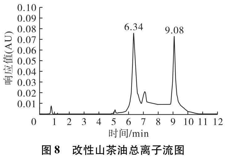 因?yàn)锳ccucoreTMC18色譜柱為非極性毛細(xì)管柱,非極性柱的保留作用主要是色散力造成的,其出峰順序一般符合沸點(diǎn)規(guī)律,沸點(diǎn)低的先出峰,沸點(diǎn)高的后出峰,所以PEG600單酯先出峰,PEG600雙酯后出峰。通過(guò)譜庫(kù)檢索發(fā)現(xiàn),6.34 min的峰主要是PEG600單酯,而9.08 min的峰主要是PEG600雙酯,這也說(shuō)明PEG600和山茶油的水解產(chǎn)物發(fā)生了酯化反應(yīng)且改性山茶油的主要成分是PEG600單、雙酯。