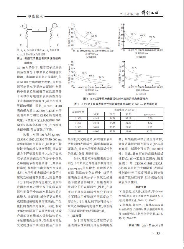 以異構(gòu)十三醇聚氧乙烯醚、順酐、丁二醇和亞硫酸氫鈉為原料合成4種陰-非離子雙子星座表面活性劑,并探究其水溶液的動(dòng)態(tài)表面張力隨溫度的變化特性。結(jié)果表明,異十三醇聚氧乙烯醚雙子星座表面活性劑因其具有異構(gòu)的烷基、聚醚鏈段和雙子星座的結(jié)構(gòu),能顯著降低水溶液的表面張力,使其具有在高、低溫中可變的HLB值特性,具有更高的高溫表面活性;隨著溫度的升高,G1300、G1303、G1305、G1310的表面張力都有較大程度降低;表面活性劑使用的最佳溫度,可以通過(guò)調(diào)節(jié)聚醚鏈節(jié)數(shù)加以調(diào)節(jié)。