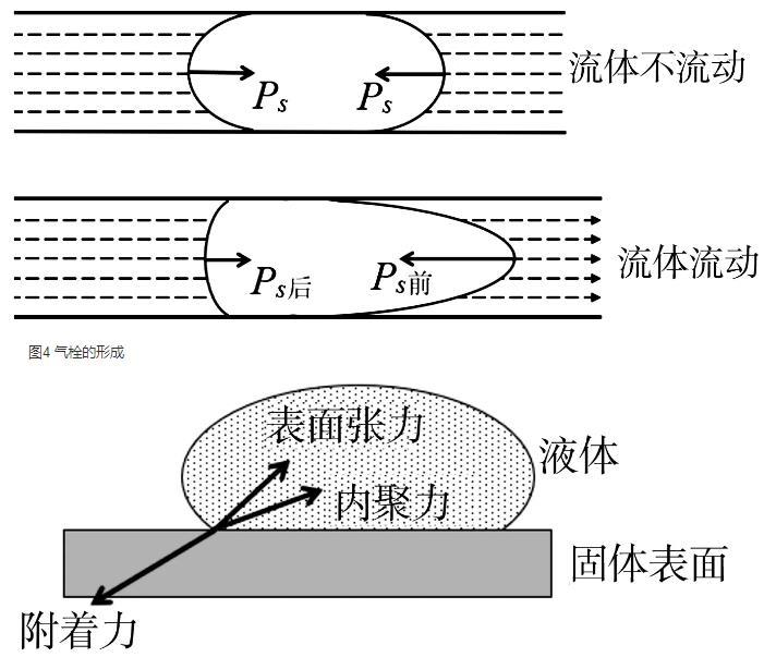 液體流動(dòng)時(shí)會(huì)受到液體中氣泡的阻礙作用。若流管較細(xì)且液體中氣泡較多時(shí)可能會(huì)因?yàn)闅怏w阻礙作用嚴(yán)重而造成流管堵塞,這種現(xiàn)象稱(chēng)氣體栓塞,簡(jiǎn)稱(chēng)氣栓。