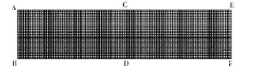 采用聚合物專用流體分析軟件Polyflow,對圓形截面的流道進行模擬分析,探討表面張力的尺寸效應(yīng)及表面張力系數(shù)和接觸角對微擠出流場的影響。由于流道結(jié)構(gòu)及流場的對稱性,本模擬采用軸對稱分析。模擬分析的流道尺寸及網(wǎng)格劃分如圖2所示。微通道尺寸AE=4×AB=1.2mm。網(wǎng)格采用四邊形結(jié)構(gòu)單元。節(jié)點數(shù)量為3751,網(wǎng)格數(shù)量為3600。