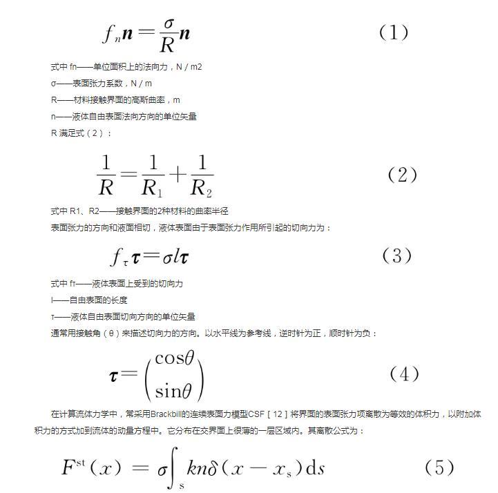 在計算流體力學(xué)中,常采用Brackbill的連續(xù)表面力模型CSF 將界面的表面張力項離散為等效的體積力,以附加體積力的方式加到流體的動量方程中。它分布在交界面上很薄的一層區(qū)域內(nèi)。其離散公式為: