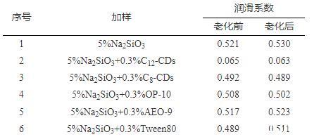 由表2可知,C12-CDs具有優(yōu)異的潤(rùn)滑效果,可顯著改善硅酸鹽水溶液的潤(rùn)滑性能,將潤(rùn)滑系數(shù)從0.521降低至0.065,潤(rùn)滑系數(shù)降低率高達(dá)87.52%,經(jīng)高溫老化后其潤(rùn)滑系數(shù)進(jìn)一步降低,表明C12-CDs能夠耐高溫耐強(qiáng)堿,與硅酸鹽配伍性良好,而碳鏈相對(duì)較短的C8-CDs對(duì)硅酸鹽水溶液并沒(méi)有表現(xiàn)出明顯的潤(rùn)滑效果。