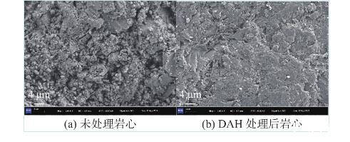 將打磨好的未處理巖心和防水鎖劑DAH處理后的巖心采用掃描電鏡進行測試,結果如圖9所示。由圖9(a)可知,未處理的巖心表面較為粗糙,存在較多大顆粒與微孔隙,在親水礦物和毛細管力的綜合作用下,巖心表面呈親水性。如圖9(b)所示,DAH處理后的巖心表面更為光滑,微孔隙數(shù)目減少,這是因為防水鎖劑中的DAT分子通過靜電作用在巖心表面吸附形成薄膜。DAT分子兩端的季銨結構可以通過靜電作用吸附在砂巖表面,中間的聚硅氧烷鏈段具有良好的柔韌性和旋轉靈活性,使得DAT分子可以在巖心表面密集覆蓋。同時聚硅氧烷鏈段的柔韌性也使其兩側的甲基可以高密度堆積,這種堆積使得巖心表面獲得較強的疏水性,從而降低了液相返排阻力,減輕了水鎖損害。