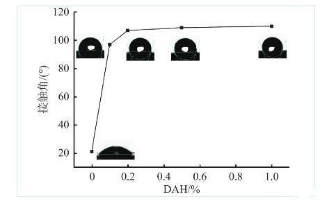 由圖4可知,未處理巖心的潤濕性為水潤濕性,蒸餾水在其表面鋪展,水相接觸角為20°,隨著DAH濃度的增大,處理后的砂巖表面接觸角逐漸增大,當DAH濃度為1%時,砂巖表面接觸角達110°,砂巖表面由親水轉變?yōu)槭杷?。上述實驗結果表明,DAH可以大幅降低水相在巖心表面的黏滯力,降低毛細管力作用,提高水相返排效率,避免水鎖損害的發(fā)生。