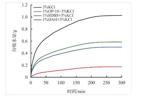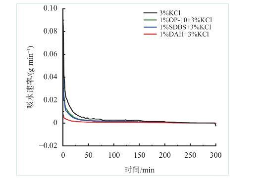 由圖5可以看出,水相會在毛細管力的作用下自吸入巖心,初始階段巖心的自吸水量較大,經過200 min后達到平衡,自吸水量不再增加;加入DAH后,巖心自吸水量下降83.1%,且相較于常用防水鎖劑OP-10、SDBS效果更佳。圖6同樣表明,加入DAH后,巖心自吸水速率大幅降低,整個自吸過程中速率緩慢。上述實驗表明,DAH可以減少因毛細管力被吸入地層的水相,從而降低水鎖損害發(fā)生的風險。