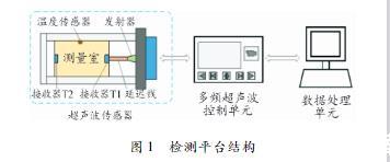 超聲波發(fā)射器、溫度傳感器、測(cè)量室和超聲波發(fā)射器組成,其中位于測(cè)量室兩端的2個(gè)超聲波接收器用于接收在變壓器油中傳播的超聲波信號(hào),超聲波發(fā)射器進(jìn)行信號(hào)發(fā)射。為保證超聲波實(shí)驗(yàn)檢測(cè)的精度,變壓器油的多頻超聲檢測(cè)是在27.5℃的水浴恒溫環(huán)境中進(jìn)行的,由位于測(cè)量室的溫度傳感器進(jìn)行監(jiān)測(cè)。數(shù)據(jù)處理單元通過(guò)數(shù)字信號(hào)處理電路與多頻超聲控制單元進(jìn)行連接,用于處理多頻超聲波接收模塊接收到的超聲波信號(hào)。經(jīng)過(guò)數(shù)據(jù)處理單元處理的超聲波信號(hào),主要包括不同接收器所接收到的超聲波信號(hào)的幅值、相位以及超聲波信號(hào)在油中傳播時(shí)的聲速和飛行時(shí)間。