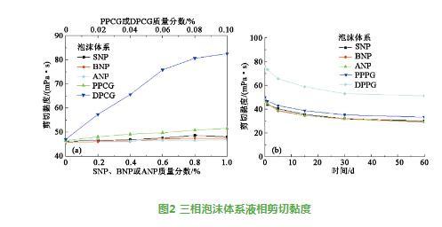 DPCG或PPCG溶于水后,吸水膨脹形成網(wǎng)格結(jié)構(gòu)的軟體內(nèi)核,外部具有親水支鏈,形成軟體微米顆粒。DPCG或PPCG與DWS和聚合物通過靜電、范德華力和纏繞作用,均勻分布在液相中。PPCG僅具有短親水支鏈,使其三相泡沫體系液相剪切黏度略增加;而DPCG具有長親水支鏈,使其三相泡沫體系液相剪切黏度明顯增加。SNP、BNP或ANP為硬質(zhì)納米顆粒,對其三相泡沫體系液相剪切黏度不產(chǎn)生影響。隨時間增加,軟體微米顆粒溶脹更充分,對體系剪切黏度的貢獻更大;而硬質(zhì)納米顆粒體系的剪切黏度主要為聚合物黏度的宏觀體現(xiàn)。DPCG或PPCG體系的剪切黏度保留率高于SNP、BNP或ANP的。