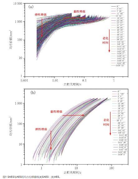 微流變可以通過跟蹤粒子的布朗運動獲得均方位移(mean square displacement,MSD)值測量樣品的黏彈性特性。從圖1中可以看出,隨著樣品老化時間的增加,SAES和AES的MSD曲線都是首先由長位移向短位移轉變,即彈性增加,粒子間碰撞增加;去相關時間由短向長的MSD曲線變化,表明二者的黏度增加。SAES和AES在樣品老化過程中,其結構都發(fā)生了變化,黏彈性都有所增加。從圖1中還可以看出,SAES和AES的黏彈性差別較大,在老化過程中SAES黏彈性變化較小,而AES的黏彈性變化較大。