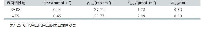 式中n是一個常數,對于1∶1型離子型表面活性劑,其在水溶液中以表面活性離子和反離子的形式存在,根據電中性原則,正離子與負離子的吸附量相等,式中n=2。R為氣體常數8.314 J/(mol·K),T為絕對溫度K,NA為阿伏伽德羅常數6.02×1023,C20為當水的表面張力降低20 mN/m時所需表面活性劑的濃度。由表面張力曲線得到AES和SAES的表面性質相關數據如表1所示。從表1可以看出,AES溶液的cmc和γcmc分別為0.45 mmol/L和30.77 mN/m,該值與文獻報道的AES的cmc(0.33 mmol/L)和γcmc(33~34 mN/m)數值接近。SAES的cmc和γcmc分別為0.42 mmol/L和27.71 mN/m。SAES和AES的cmc值基本一致,這可能是由于二者具有相同的碳原子數,分子之間的疏水相互作用基本相同所致。相比AES,SAES由于支化結構的存在,增加了表面活性劑分子在水表面的覆蓋率,從而使γcmc有所降低。這與一些文獻報道的支鏈型表面活性劑降低表面張力的能力優(yōu)于直鏈型的結果相一致。支鏈化的結構也使其Amin增大,Гmax減小。
