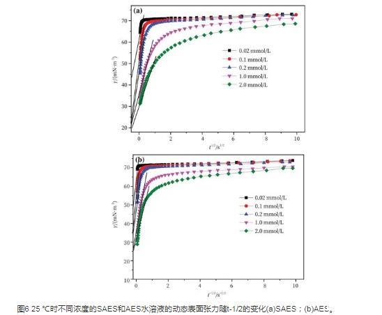 從圖4可以看出所測不同濃度不同表面活性劑的表面張力在初始階段均快速下降,一定時間后趨于平穩(wěn)狀態(tài)。這是因為動態(tài)表面張力測試過程中新形成的表面遠偏離于平衡態(tài),吸附層離子的濃度很低,體相與吸附層的濃度差大,因此動態(tài)表面張力變化很大。隨著吸附的進行,次表面濃度和表面濃度逐漸增大,擴散和吸附的速度均逐漸降低,動態(tài)表面張力隨著吸附時間的增加而降低的趨勢也逐漸變得平緩。當表面活性劑濃度增大時,表面張力的下降幅度和速度也隨之增大,而且相應地縮短了到達平衡狀態(tài)的時間。這種隨體系濃度的增加達到平衡所需的時間越短的趨勢與已經報道的一些烷基表面活性劑的結果是相一致的。在相同濃度下,SAES表面張力下降的速率大于AES,這是由于SO4-在碳氫鏈中間的化合物比在端點者擴散速度快。