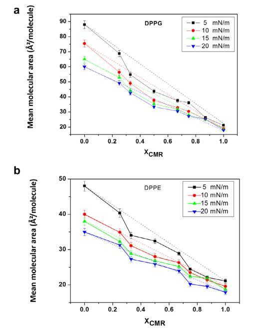 分子面積作為 CMR/ DPPG如圖5a所示。 可以看出負(fù)偏差 mma (XCMR = 0.33–0.67) 由于分子吸引力相互作用的增加。 CMR/DPPG 薄膜被認(rèn)為是部分混溶和非理想的浮動(dòng)單層,因?yàn)榫€性度不高 觀察到的。 CMR/DPPE 混合薄膜的結(jié)果在 XCMR=0.25 和 0.67 時(shí)表現(xiàn)出不同的斷裂點(diǎn)(圖 5b)。 DAE 節(jié)目 包裝效率甚至幾何形狀的改進(jìn) 調(diào)節(jié)發(fā)生在較低的 XCMR(圖 6)(Andrade 等人, 2006; 周和張,2000)。