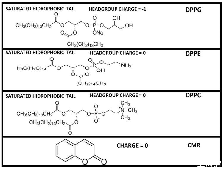 圖 2. 磷脂和香豆素分子結(jié)構(gòu)。 DPPC 和 DPPC 具有圓柱形分子形狀,而 DPPE 具有錐形幾何形狀。