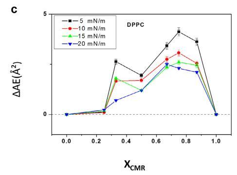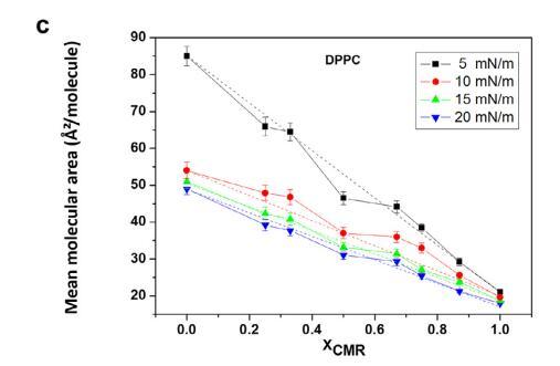 純和混合單層的 pA 等溫線與分子面積的關(guān)系如圖 1 所示。CMR/DPPG 等溫線顯示出與純 DPPG 脂質(zhì)相似的趨勢(shì)(圖 1a)。 相似相 對(duì)所有 CMR/DPPG 混合物都觀察到了轉(zhuǎn)變。 DPPG 和 DPPC 顯示崩潰壓力 (DPcoll) 為 52 mN.m-1 次方和 60 mN.m-1次方 , 分別。 一個(gè)過渡 (p ffi 3 mN.m-1次方 ) 從液體 發(fā)現(xiàn)純 DPPE 單層膨脹為凝聚相 與 D. coll 在 ffi55 mN.m-1次方 . 為 D. coll 獲得的值 純脂質(zhì)與文獻(xiàn)一致(Vollhardt 等人, 2000; 諾沃塔斯卡等人,2014 年)。