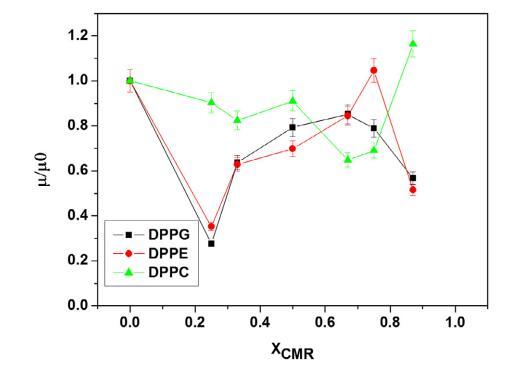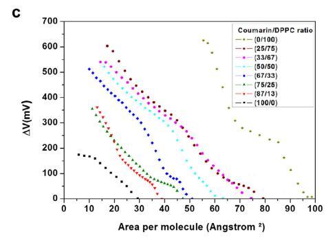 作為函數(shù)分子面積 (ΔVA) 的表面電位為 如圖3a所示。 為所有研究的磷脂獲得的 ?V 值 與之前的報(bào)告相似(Andrade et al., 2006; Nowotarska 等,2014)。 ?V(460 mV 至 275 mV)逐漸降低 對(duì)于 DPPG,觀察到 CMR 摩爾分?jǐn)?shù)的函數(shù)。 ?V 易受極性和非極性基團(tuán)的取向影響。