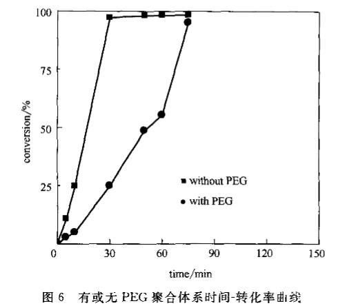 圖6有或無PEG聚合體系時間一轉(zhuǎn)化率曲線