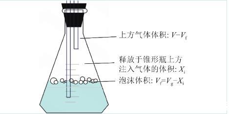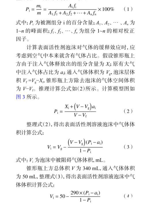 計(jì)算表面活性劑泡沫對(duì)氣體的緩釋效應(yīng)時(shí),應(yīng)考慮到空氣中本來就含有氣體占比。假設(shè)錐形瓶上方由于注入氣體釋放出的組分含量為Xi;原有大氣中注入氣體占比為ai;通入氣體體積為Vg,泡沫層體積Vf=Vg?Xi,錐形瓶上方除去泡沫的氣體空間體積為V?Vf。推理計(jì)算公式如(2)所示。計(jì)算模型圖如圖3所示。
