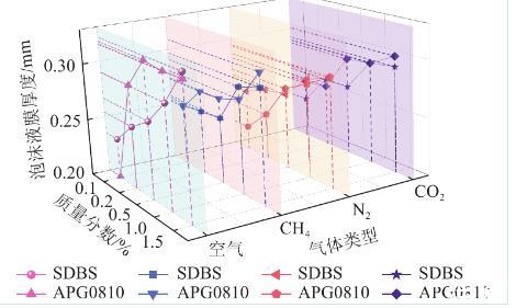 空氣、甲烷及氮?dú)獾姆€(wěn)泡性規(guī)律大致相同,注入空氣情況下,SDBS溶液質(zhì)量分?jǐn)?shù)為0.15%時泡沫半衰期約為786.5 s,二氧化碳注入液體的穩(wěn)泡性明顯下降,質(zhì)量分?jǐn)?shù)為0.15%時為584 s,比空氣低202.5 s。推測這是由于二氧化碳為酸性氣體,表面活性溶液在酸性環(huán)境下泡沫穩(wěn)定性不足,泡沫液膜強(qiáng)度不易控制酸性氣體造成的。而APG0810表面活性劑溶液泡沫半衰期在四種氣體注入情況下差異不明顯,是由于APG0810為非離子表面活性劑,在溶液中不是以離子狀態(tài)存在,由此可以推出它的穩(wěn)定性高,不易受強(qiáng)電解質(zhì)影響,也不易受酸、堿影響。