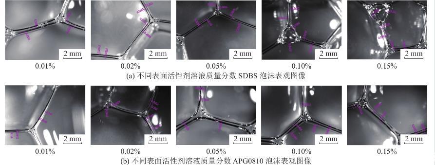 根據(jù)以上試驗(yàn)結(jié)果可以獲得,溶液表面張力越小,則溶液發(fā)泡性能越好,溶液表面張力與發(fā)泡特性有較明顯相關(guān)性,而溶液黏度與泡沫性質(zhì)相關(guān)性不顯著。APG0810溶液黏度隨質(zhì)量分?jǐn)?shù)增加而增加,發(fā)泡性及泡沫穩(wěn)定性也逐漸增加,而SDBS溶液黏度先隨著溶液質(zhì)量分?jǐn)?shù)增加而降低,濃度較大時有上升趨勢,溶液發(fā)泡性及泡沫穩(wěn)定性呈現(xiàn)逐漸增加趨勢,且發(fā)泡性與泡沫穩(wěn)定性均優(yōu)于APG0810溶液。