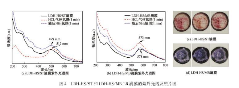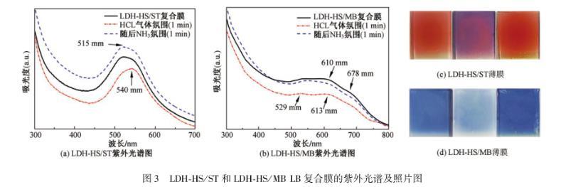 圖3(a)和3(b)分別顯示的是LDH-HS/ST和LDH-HS/MB多層LB復(fù)合膜沉積在石英底片上測(cè)得的UV光譜,以及經(jīng)1 min HCl氣體氛圍處理后和1 min NH3氣體氛圍處理后的UV變化光譜圖。圖3(c)和3(d)對(duì)應(yīng)展示了LDH-HS/ST和LDH-HS/MB復(fù)合膜酸堿氣體氛圍下石英片顏色變化前后對(duì)比圖。