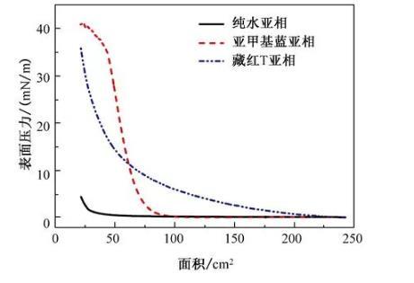 圖1 LDH-HS薄膜在純水、MB和ST亞相中的表面壓力-面積(π-A)等溫線