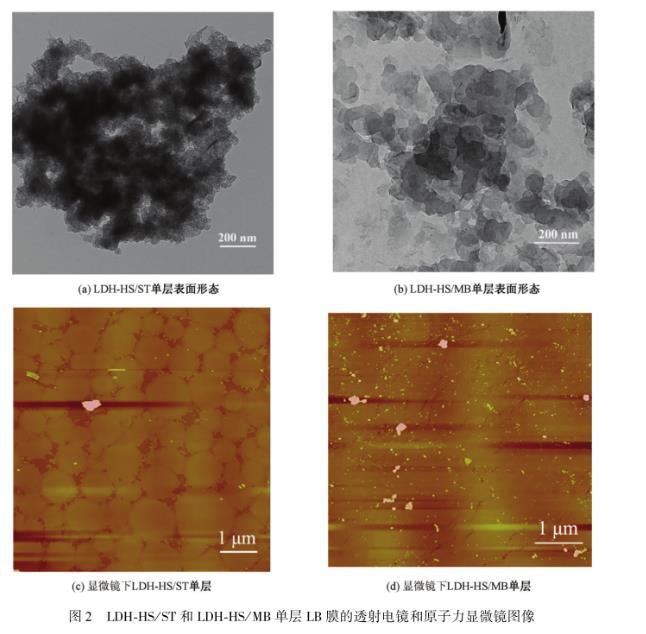 圖2 LDH-HS/ST和LDH-HS/MB單層LB膜的透射電鏡和原子力顯微鏡圖像