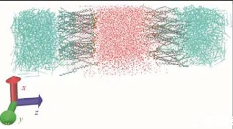 在進行分子動力學模擬之前構(gòu)建出合理的力場是極為重要的工作。本文通過Autom-ated Topology Builder(ATB)and repository生成的GROMOS系列力場參數(shù),利用現(xiàn)有的數(shù)據(jù)庫以及量子化學進行計算,同時它可以充分考慮到分子中的對稱結(jié)構(gòu),使其反映出的分子性質(zhì)及參數(shù)更為精確。但ATB只能處理原子數(shù)小于40的分子,對于分子數(shù)大于40的分子結(jié)構(gòu)需進行拆分。在獲取準確的電荷及鍵參數(shù)之后利用packmol程序定向排列分子將其堆砌成立方體結(jié)構(gòu)。此外,本文選取的油-水界面需使表面活性劑平均分布在水相兩側(cè),親水基靠近水相,疏水基靠向油相。圖2為初始狀態(tài)下體系截圖,其中中間紅色部分為水分子,左右兩側(cè)藍色部分為癸烷分子,油水中間即OPES分子。