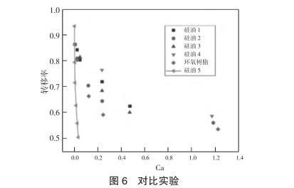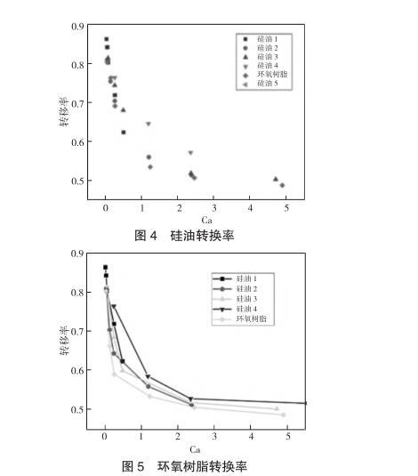 對(duì)不同黏度以及拉伸速度下的膠液進(jìn)行測(cè)量并計(jì)算轉(zhuǎn)移率,如圖4所示,在忽略慣性力的條件下,采用無量綱數(shù)Ca來表示轉(zhuǎn)移率,對(duì)于表面張力相似且不同黏度的四種甲基硅油的轉(zhuǎn)移率有著相似的收斂情況。為了進(jìn)一步印證Ca對(duì)轉(zhuǎn)換率的影響,引入與甲基硅油不同表面張力的環(huán)氧樹脂進(jìn)行對(duì)比實(shí)驗(yàn),如圖5所示,表面張力較大的環(huán)氧樹脂的轉(zhuǎn)換率會(huì)比甲基硅油小,但整體趨勢(shì)相差不大,均會(huì)收斂到一定數(shù)值。之后,為了了解慣性力對(duì)轉(zhuǎn)移率的影響,選擇黏度較小的膠液進(jìn)行實(shí)驗(yàn),同時(shí)加大移液針直徑使其脫離微量點(diǎn)膠的范圍,以提高慣性力對(duì)膠液傳遞的影響,如圖6所示,在通過增加膠液體積以提高慣性力影響的實(shí)驗(yàn)中,膠液轉(zhuǎn)移率的變化與之前有極大差異。