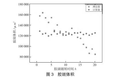 在液橋斷裂后,轉(zhuǎn)移到點(diǎn)膠面上的膠液在自身表面張力的作用下形成圓潤(rùn)的膠斑,在理想狀態(tài)下膠斑可視為球冠狀,其體積可用球冠狀公式求得。實(shí)驗(yàn)主要使用的膠液為甲基硅油,其表面張力只有21 mN/m,低于環(huán)氧樹脂,在基板上由甲基硅油形成的膠斑在穩(wěn)定狀態(tài)下與環(huán)氧樹脂的形狀不同,因此不能將其視為球冠狀,需要其他計(jì)算體積的方法。為了提高計(jì)算的準(zhǔn)確性通過灰度處理、二值化等圖像處理的方法提取膠斑的輪廓信息,之后通過提取到的坐標(biāo)信息來擬合膠斑輪廓的函數(shù),使用旋轉(zhuǎn)積分的方法來計(jì)算膠斑的體積。之后為了驗(yàn)證計(jì)算的準(zhǔn)確性,在其他物性條件相同時(shí),將5 000 cps的甲基硅油、3 mm/s的移液針抬升速度的實(shí)驗(yàn)條件下膠斑的鋪展過程作為研究對(duì)象。用顯微鏡錄制在液橋斷裂后膠斑的鋪展情況,以0.016 s為間隔,截取20張膠斑的圖片分別用公式和積分法進(jìn)行膠斑體積的計(jì)算,結(jié)果如圖3所示。
