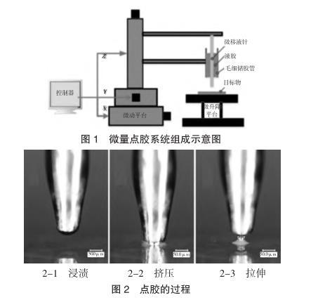 本課題組研制了一種基于移液針轉(zhuǎn)印原理的微量點(diǎn)膠系統(tǒng),該點(diǎn)膠系統(tǒng)所形成的膠斑直徑可達(dá)到數(shù)十微米,膠滴體積可達(dá)飛升-皮升的范圍。該系統(tǒng)的結(jié)構(gòu)如圖1所示。該系統(tǒng)由出膠單元、驅(qū)動(dòng)單元和控制單元組成。其中,出膠單元為系統(tǒng)的核心,其主要包含微移液針和毛細(xì)儲(chǔ)膠管兩個(gè)關(guān)鍵元件,移液針通過在儲(chǔ)膠管內(nèi)的上下往復(fù)運(yùn)動(dòng),實(shí)現(xiàn)膠液向基板的微量轉(zhuǎn)移。驅(qū)動(dòng)單元由X/Y/Z三個(gè)方向的驅(qū)動(dòng)電機(jī)和微升降平臺(tái)組成,用于驅(qū)動(dòng)微移液針及點(diǎn)膠工件的運(yùn)動(dòng)??刂茊卧蒔LC控制系統(tǒng)和LaBview開發(fā)的控制面板組成,實(shí)現(xiàn)對(duì)電機(jī)運(yùn)動(dòng)的自動(dòng)控制。