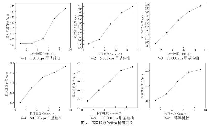 點(diǎn)膠結(jié)果最直觀的顯示就是形成膠斑達(dá)到穩(wěn)定狀態(tài)時(shí)膠斑的直徑,因此對(duì)膠斑的直徑進(jìn)行研究。選取5種表面張力相似黏度不同的甲基硅油以及黏度為10 000 cps的環(huán)氧樹脂作為實(shí)驗(yàn)用膠。移液針抬升速度分別設(shè)置為1 mm/s,3 mm/s,5 mm/s,7 mm/s,9 mm/s。使用的移液針直徑為200μm。實(shí)驗(yàn)結(jié)果如圖7所示。