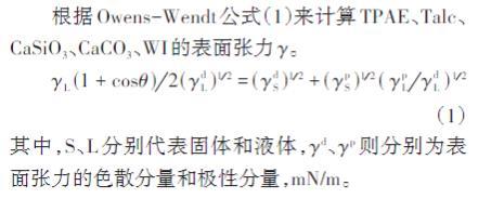根據(jù)Owens-Wendt公式(1)來計算TPAE、Talc、CaSiO3、CaCO3、WI的表面張力γ。