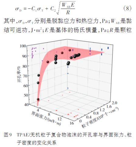 無(wú)機(jī)粒子與TPAE具有較高界面張力,并且粒子在TPAE基體中的分布密度較大時(shí),復(fù)合物傾向于形成具有更高開(kāi)孔率的泡沫。其中對(duì)于TPAE/CaSiO3復(fù)合物,CaSiO3的團(tuán)聚現(xiàn)象導(dǎo)致的粒子尺寸增加也對(duì)泡沫的開(kāi)孔率產(chǎn)生改善效果。此現(xiàn)象的理論依據(jù)可追溯至Vollenberg和Heikkinen提出的關(guān)于脫黏所需起始應(yīng)力的公式(8)
