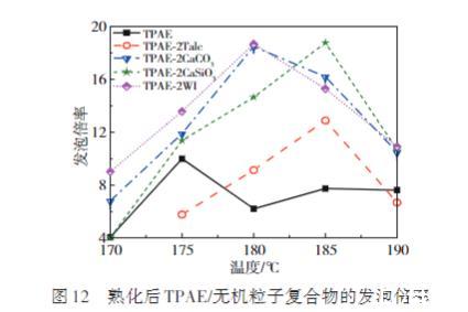 圖12展示了4種TPAE/無(wú)機(jī)粒子泡沫熟化后的發(fā)泡倍率隨溫度變化的情況。結(jié)果表明,相較于純TPAE,4種復(fù)合物泡沫的最終發(fā)泡倍率均有所增加,其中TPAE/CaCO3、TPAE/CaSiO3及TPAE/WI顯著提升。已知影響發(fā)泡倍率的主要因素有發(fā)泡劑的溶解度和聚合物的流變性能。由于無(wú)機(jī)粒子的添加量較少,基本不會(huì)影響CO2在復(fù)合物中的溶解度及流變性能。因此TPAE/無(wú)機(jī)粒子復(fù)合物的初始發(fā)泡倍率與純TPAE基本一致,但無(wú)機(jī)粒子的添加會(huì)促進(jìn)TPAE形成開(kāi)孔結(jié)構(gòu),尤其是CaCO3、CaSiO3以及WI可使TPAE形成高開(kāi)孔率的泡沫,減小了泡沫的收縮,使得完全熟化后的發(fā)泡倍率遠(yuǎn)高于TPAE,大大提高了TPAE的發(fā)泡性能。