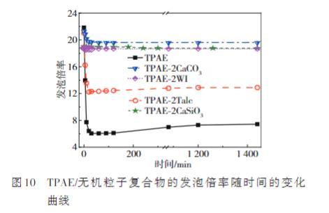 圖10 TPAE/無(wú)機(jī)粒子復(fù)合物的發(fā)泡倍率隨時(shí)間的變化曲線