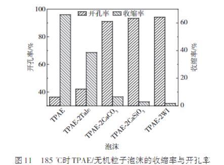 圖11 185℃時(shí)TPAE/無(wú)機(jī)粒子泡沫的收縮率與開(kāi)孔率