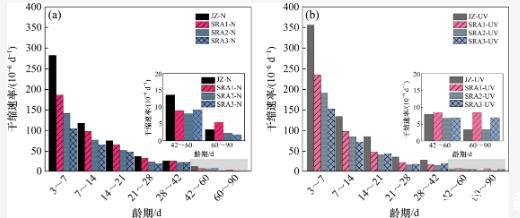 比較2種環(huán)境下各組試樣的干縮變形變化規(guī)律,發(fā)現(xiàn)基準(zhǔn)組與SRA試驗(yàn)組呈現(xiàn)出不一樣的變化趨勢(shì)。由圖4可知,在強(qiáng)紫外線輻射環(huán)境下,基準(zhǔn)組(JZ)在3~21 d齡期內(nèi)的干縮速率遠(yuǎn)高于其在標(biāo)準(zhǔn)干燥環(huán)境下的干縮速率,最終表現(xiàn)為JZ組在強(qiáng)紫外線輻射環(huán)境下的干縮變形增加,說(shuō)明在溫度和濕度一致的條件下,強(qiáng)紫外線輻射會(huì)增大水泥石的干縮變形。