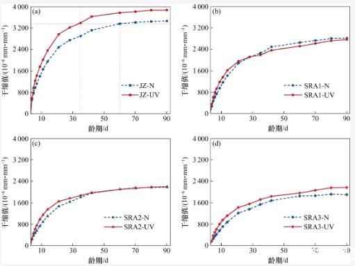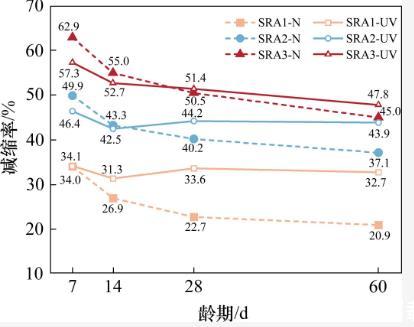 從圖3中可以觀察到,隨著齡期的延長(zhǎng),干縮曲線SRA2-UV逐漸接近于干縮曲線SRA3-UV,而SRA3-UV的干縮值沒(méi)有進(jìn)一步降低。這表明上述分析是合理的。在強(qiáng)紫外線輻射下,當(dāng)減縮劑的摻量超過(guò)3%時(shí),其孔隙溶液中的SRA濃度超過(guò)臨界濃度(CMC),進(jìn)一步增大摻量不能增強(qiáng)SRA在該應(yīng)用環(huán)境中的減縮效果。