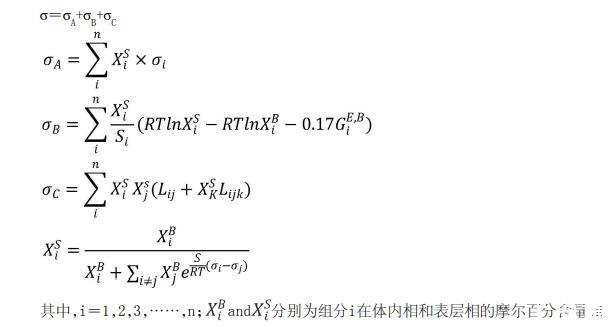 在一些實施方式中,基于表面張力模型和最優(yōu)擬合參數計算高階多元合金的表面張力包括: